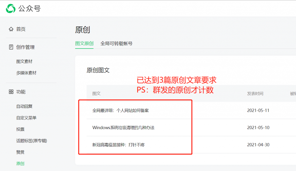 点击公众号后台,点击左侧【原创】,查看”原创图文“一栏内,是否达到同一作者名下群发过3个原创文章?肯定还没有。